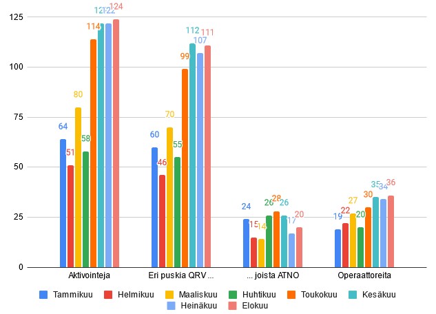 - Elokuussa toteutui ainakin 124 OHFF-aktivointia (ilmeisesti kaikkien aikojen ennätys!) 111 eri puskaan 36 operaattorin toimesta. Uusia puskia korkattiin 20 kpl. Kesä on ollut puskamielessä hyvin vauhdikas, sillä aktivointeja oli kesä-elokuussa yli 360 kpl, keskiarvona siis noin 4 per päivä.