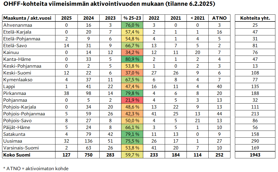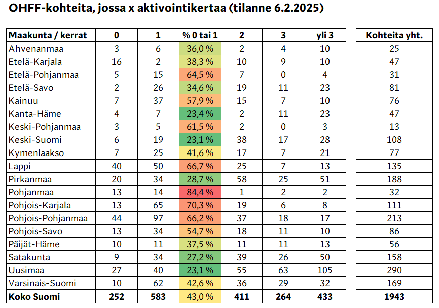 Alla on kaikille tilastonörteille tietoa OHFF-kohteista kahdella eri tavalla tarkasteltuna: kohteiden jaottelu maakunnittain ja 1) aktivointikerroittain tai 2) viimeisimmän aktivointivuoden mukaan. Puskia on alkuvuoden 2025 lisäysten jälkeen yhteensä 1943 kpl (välillä OHFF-0001 -> 1961).